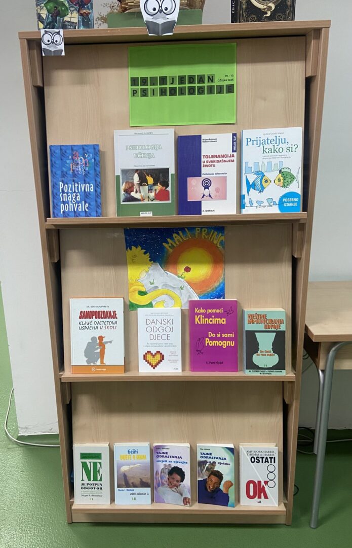 Tijekom cijelog Tjedna psihologije postavljena je izložba knjiga iz područja psihologije za učenike, učitelje i roditelje u školskoj knjižnici. Svi zainteresirani imali su priliku upoznati se s različitim temama poput emocija, ponašanja i međuljudskih odnosa te potaknuti interes za čitanje i osobni razvoj.