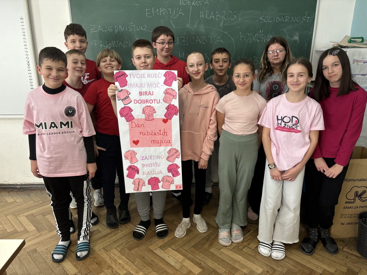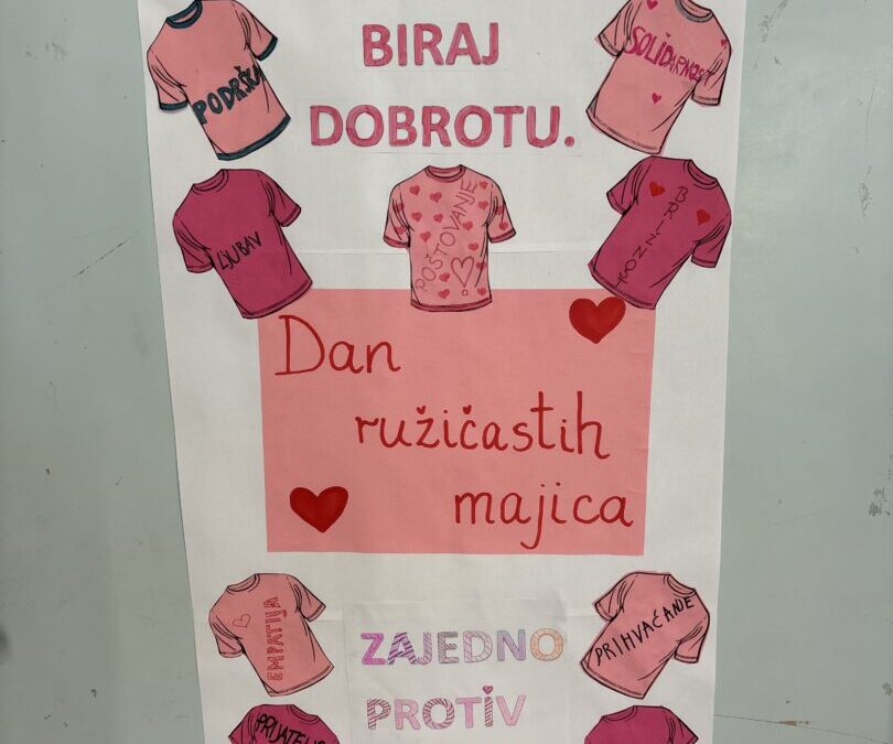 U srijedu, 25. veljače, učenici 5.a razreda su sa svojom razrednicom obilježili Dan ružičastih majica – nacionalni dan borbe protiv vršnjačkog nasilja, sudjelujući u radionici pod nazivom „Tvoje riječi imaju moć – biraj dobrotu“.