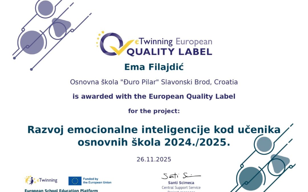 Nakon što je našem eTwinning projektu „Razvoj emocionalne inteligencije kod učenika osnovnih škola“, koji je proveden s učenicima 3.d razreda tijekom školske godine 2024./2025. dodijeljena Nacionalna oznaka kvalitete, s ponosom objavljujemo da smo osvojili i Europsku oznaku kvalitete!