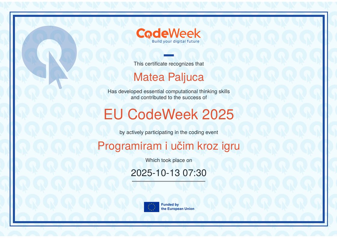 Europski tjedan programiranja je društvena inicijativa čiji je cilj na zabavan i angažirajući način svima približiti programiranje i digitalnu pismenost. Ovogodišnji Europski tjedan programiranja provodio se u vremenskom razdoblju od 13. do 17. listopada 2025. godine, kada i Dani Erasmusa u našoj školi. Učenici 2., 3., i 4. razreda Osnovne škole Đuro Pilar u Slavonskom Brodu pod moderatorstvom učiteljice informatike Matee Paljuce, sudjelovali su u događanju kroz različite aktivnosti upisavši iste na kartu događanja: