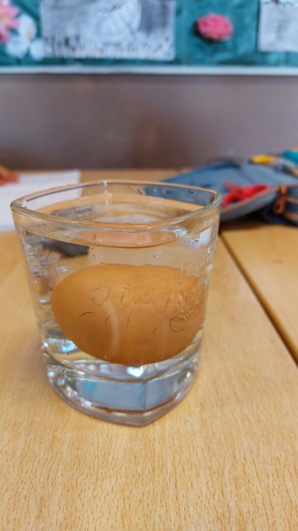 U drugom pokusu učenici su izrađivali „elastično jaje koje svijetli“. Jaje su pažljivo položili u čašu i prelili ga octom tako da je bilo potpuno prekriveno. Nakon otprilike 48 sati primijetili su da se ljuska razgradila, pa su jaje izvadili i lagano isprali vodom. Dodirivanjem su otkrili da je jaje postalo mekano i elastično, gotovo poput gumene loptice. Kada su ga stavili na izvor svjetla, uočili su da jaje propušta svjetlost i „svijetli“, što ga čini prozirnijim nego prije.