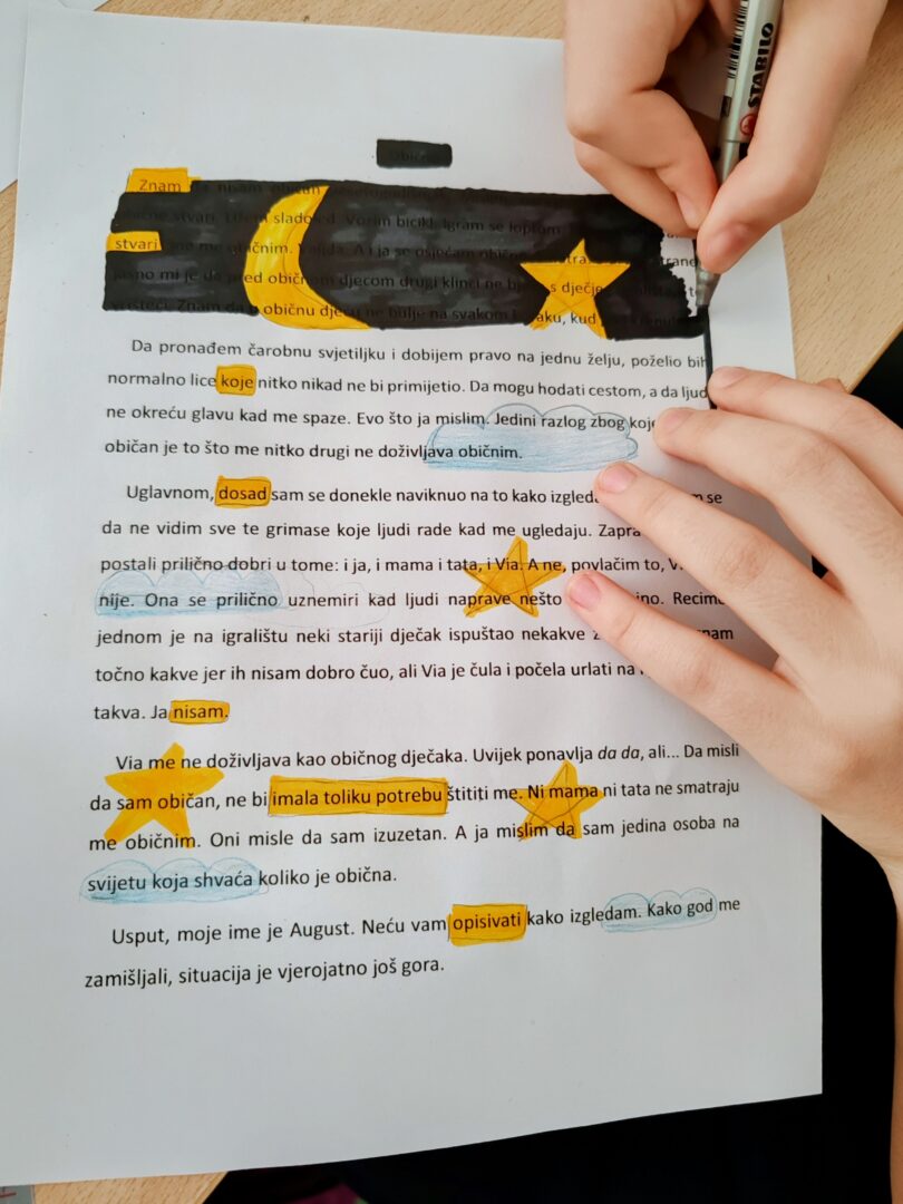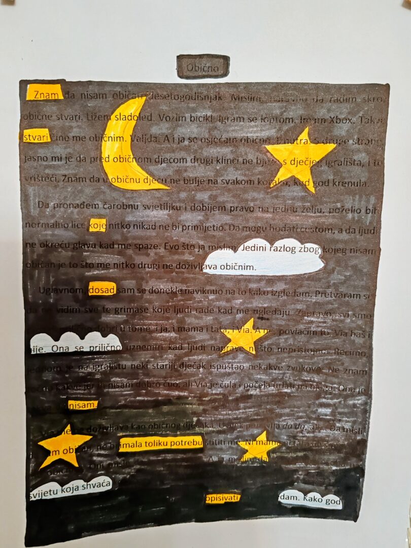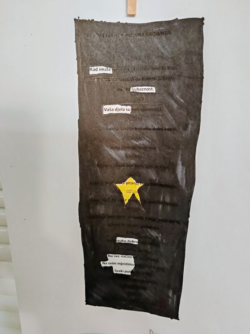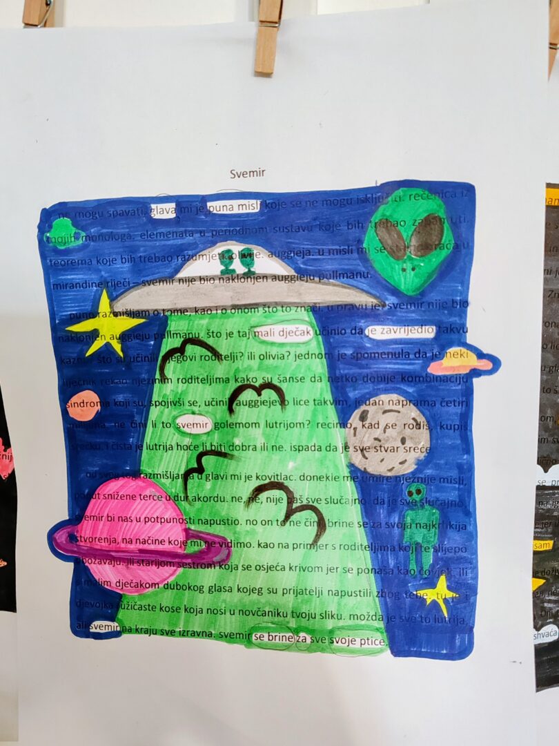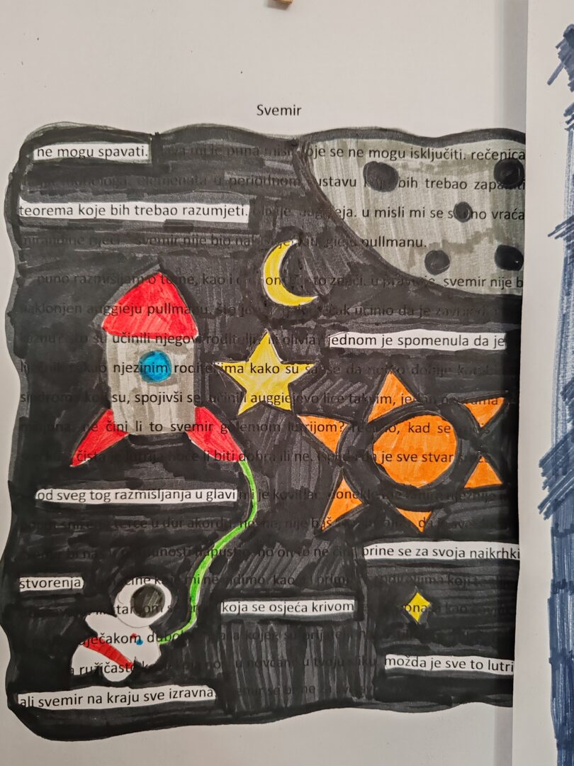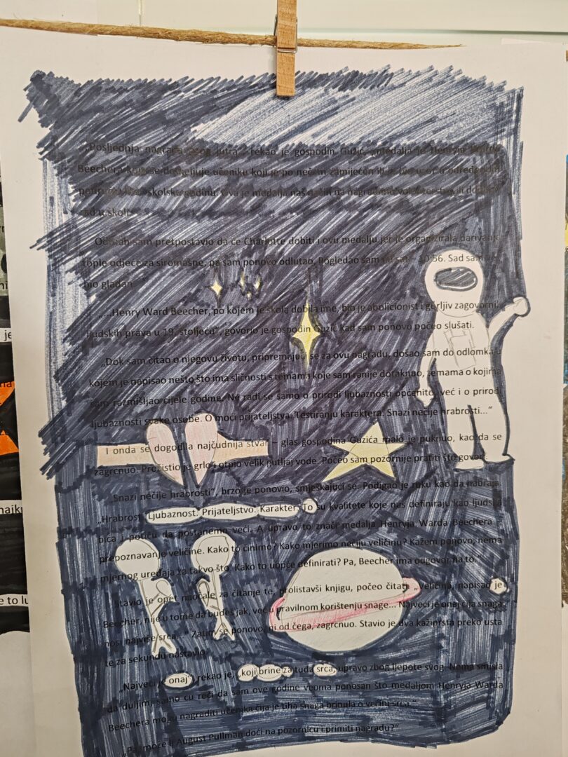 Tema je dodatno objašnjena kroz stihove Tina Ujevića i njegovu pjesmu „Pobratimstvo lica u svemiru“, a koja naglašava mir, empatiju i zajedništvo među ljudima. Kroz te misli podsjetili smo se da, iako smo različiti, svi dijelimo isti unutarnji svemir misli, snova i osjećaja. Kao inspiracija poslužio je i lik Auggieja Pullmana iz knjige Čudo, koji nas uči prihvaćanju različitosti i važnosti dobrote.