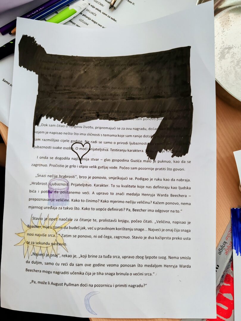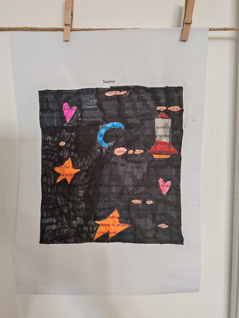 Radionica se sastojala od pet dijelova: uvoda u temu, uputa za kreativni rad, izrade blackout poezije, izložbe i čitanja radova te stvaranja zajedničke poruke. Kroz ovu aktivnost naglašena je važnost razumijevanja, poštovanja i stvaranja vlastitog „svemira“ poruka. Učenicima se posebice svidjela aktivnost u kojoj su se bavili blackout poezijom jer su mogli pokazati svoju kreativnost i iz koje su proizašli divni radovi. U aktivnostima su sudjelovali učenici 5.c i d te 6.d iz PŠ na Koloniji, a iz MŠ Brodsko Vinogorje učenici 6.a i 6.b, a budno su ih pratile nastavnice hrvatskoga jezika Irena Tomašić i Maja Šimić te knjižničarka Jasna Livada.