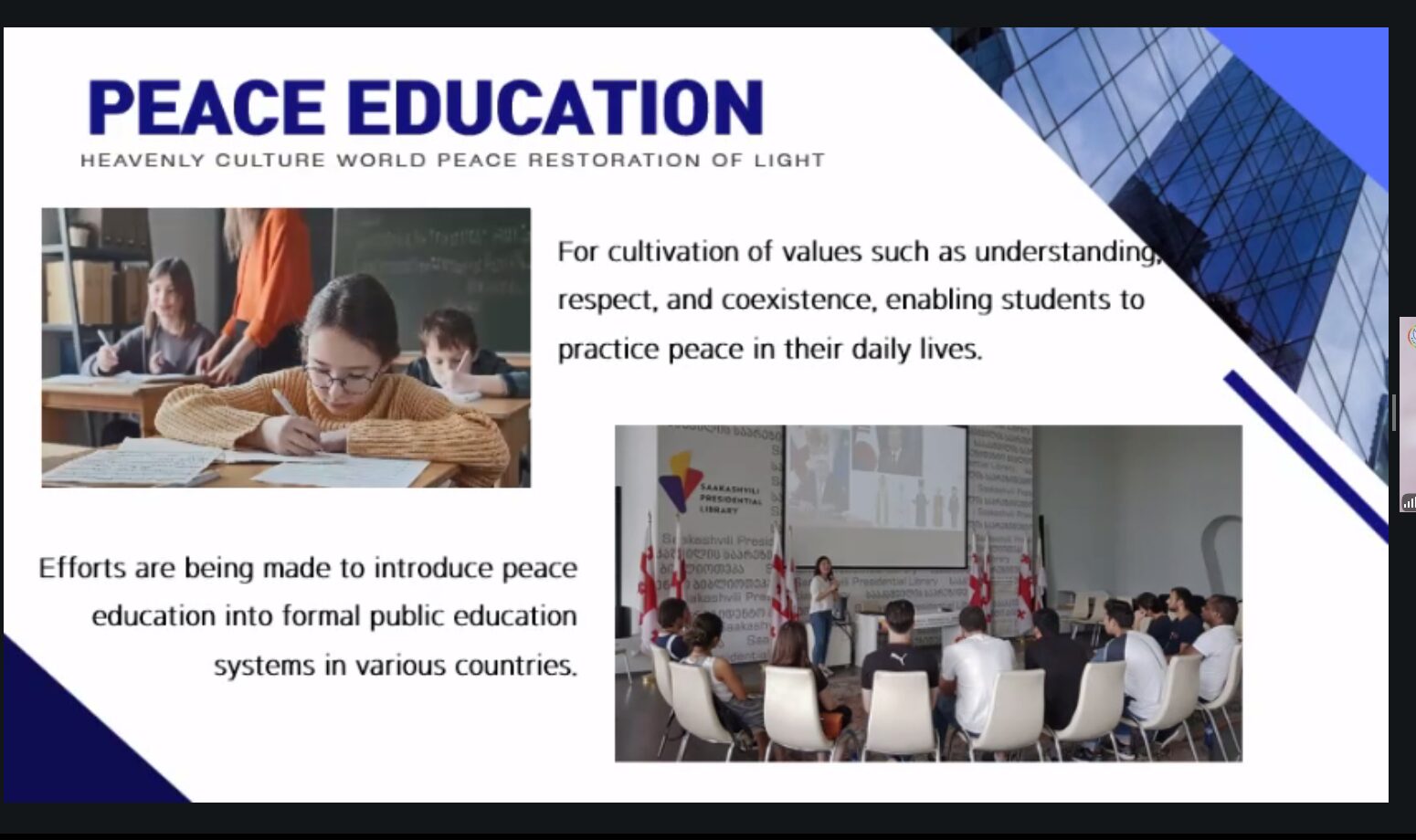 Dana 7. travnja 2026, je predstavnik naše škole, ravnatelj Igor Nikičić sudjelovao u međunarodnom mrežnom susretu inicijative DPCW (Declaration of Peace and Cessation of War) Education. Aktivnost je nastavak suradnje naše škole sa HWPL (https://www.peacedirect.org/ ) organizacijom iz Južne Koreje a u skladu je sa školskom strategijom internacionalizacije. Peace Direct je međunarodna dobrotvorna organizacija posvećena zaustavljanju nasilja diljem svijeta. To čini osnaživanjem lokalnih mirotvoraca da riješe sukobe i izgrade trajni mir za svoje zajednice a povezana je sa Ujedinjenim narodima (UN).