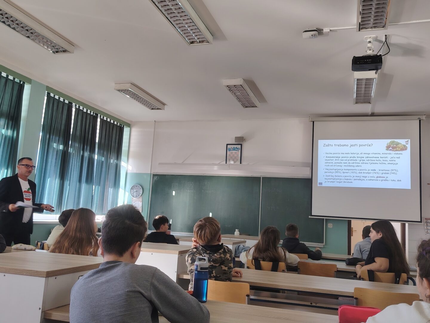 Učenici su sa zanimanjem i pozorno pratili predavanje te postavljali pitanja vezana uz ulogu voća i povrća u zdravoj prehrani.