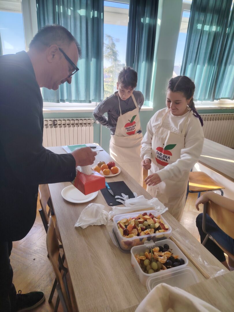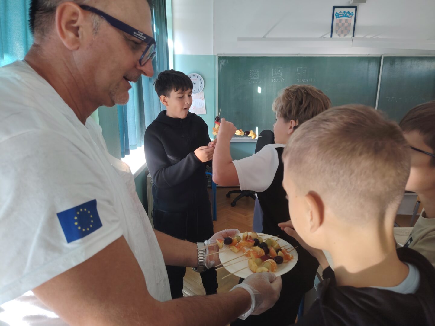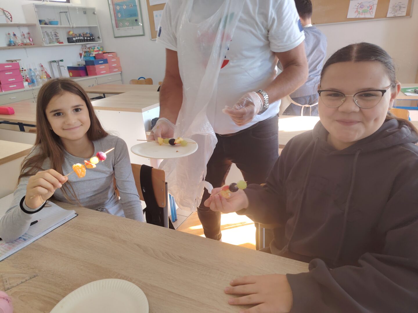 Nakon održanog predavanja, učenici su kušali različito voće koje im je profesor predstavio. Učenici su samostalno napravili voćne ražnjiće te tako kušali jabuke, mandarine, kruške i grožđe.