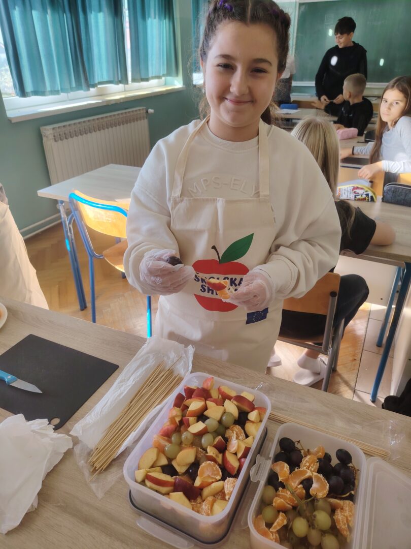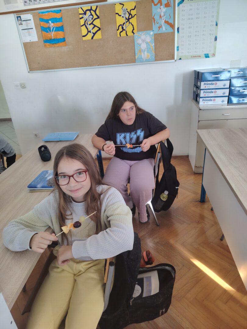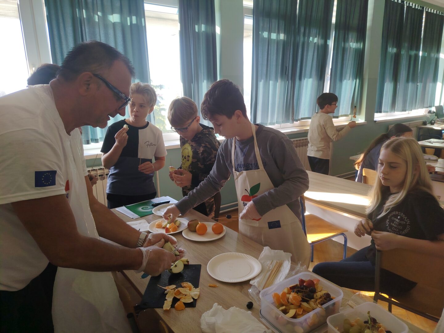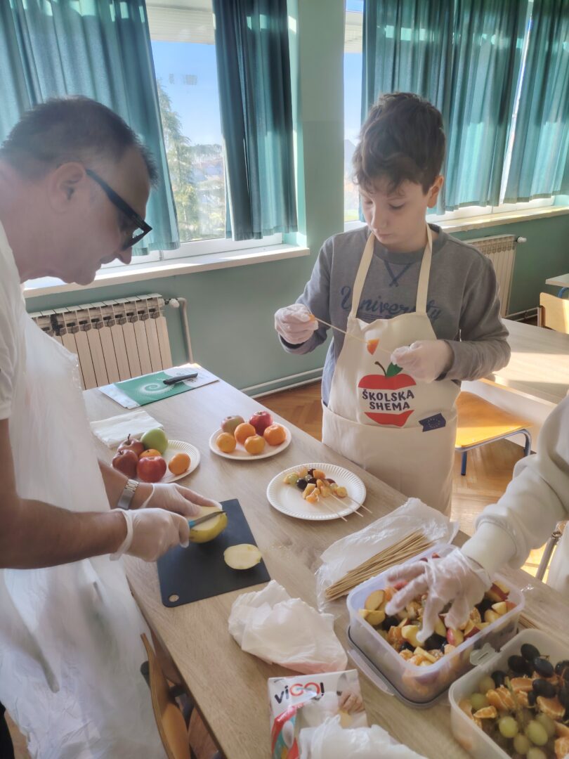 Nakon održanog predavanja, učenici su kušali različito voće koje im je profesor predstavio. Učenici su samostalno napravili voćne ražnjiće te tako kušali jabuke, mandarine, kruške i grožđe.